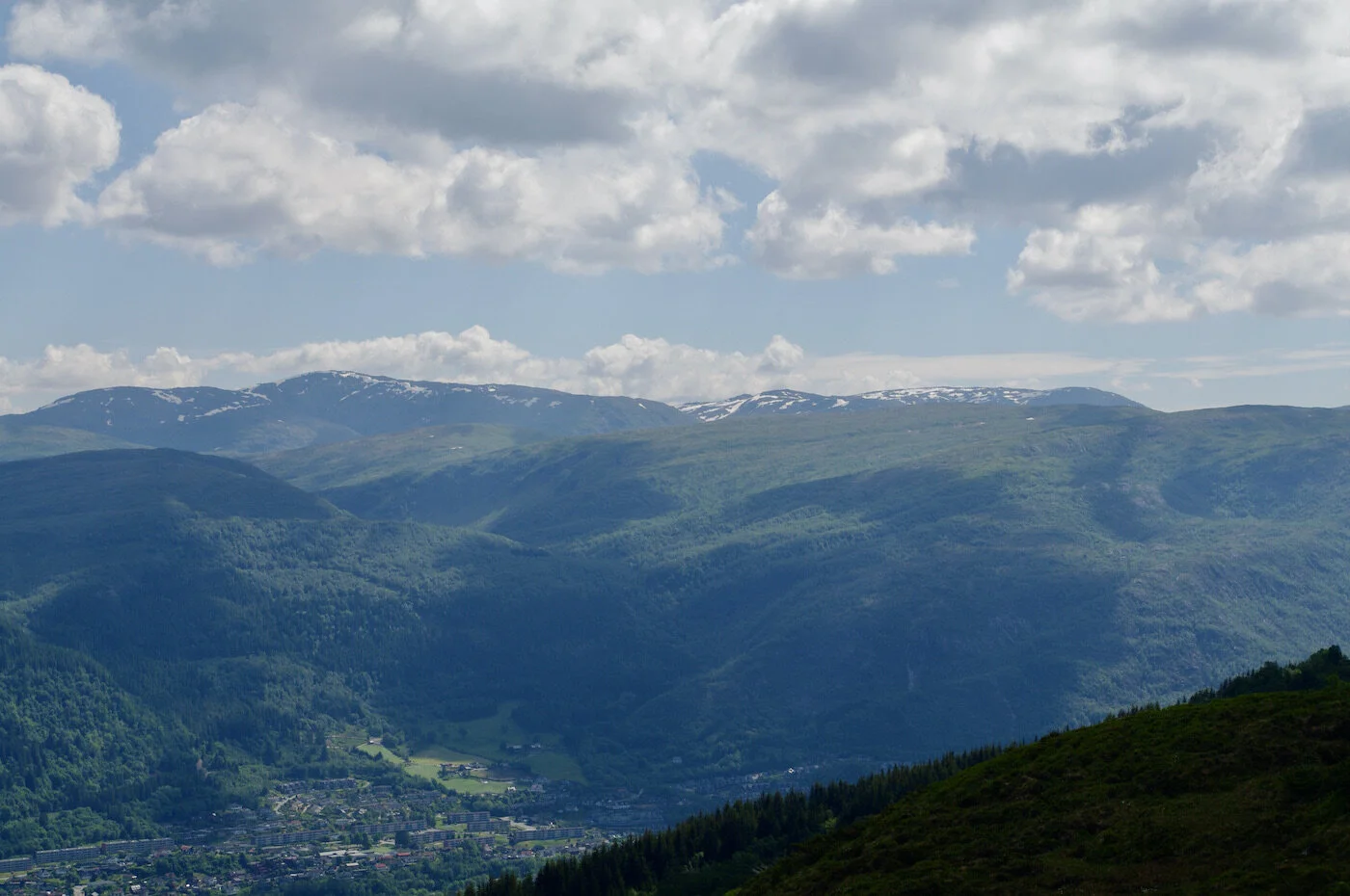Utsikt fra Vardegga mot Vikinghytten og Åsane med Høgstefjellet og Veten t.h.