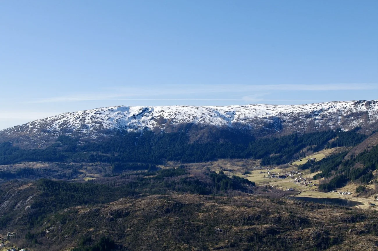 Storflott utsikt fra Ådnabu mot sør til Espeland og Haukeland med Livarden t.v. og Skavdalsfjellet t.h.