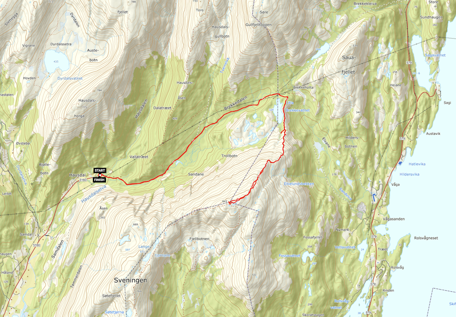 Etter en god rast og fotorunde på topp-platået, går vi samme rute og sti ned igjen til turparkeringen i Hausdalen.
