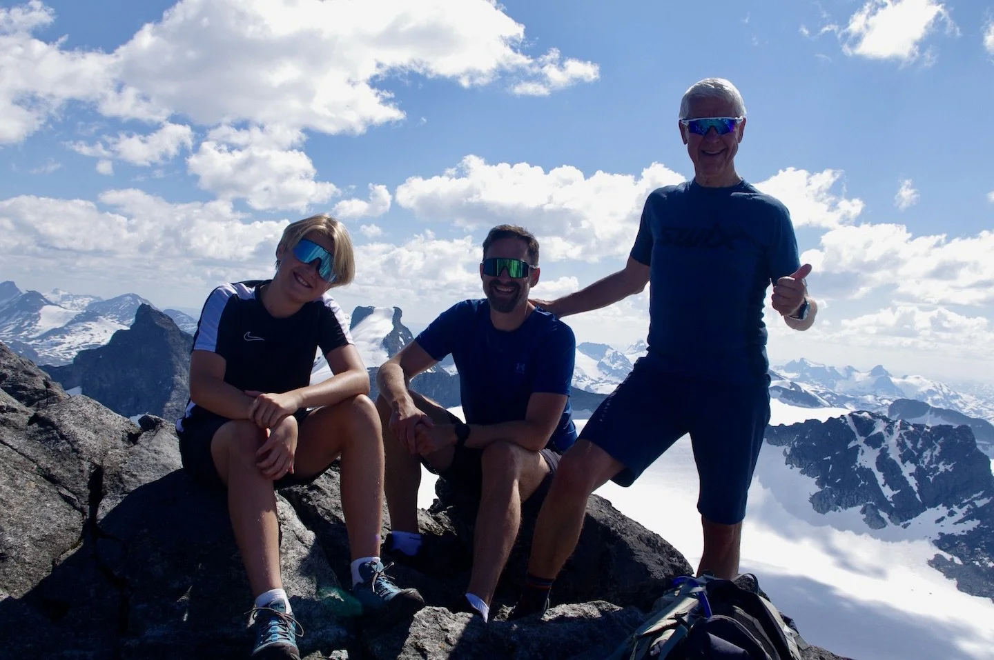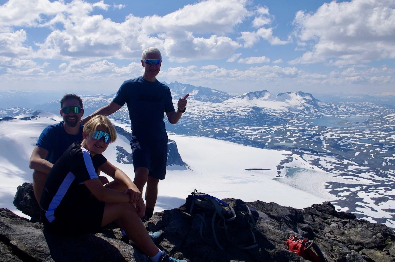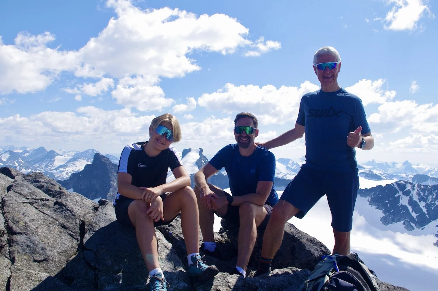 Stolt farfar med sønn og barnebarn på toppen av Store Smørstabbtinden 2208 moh.