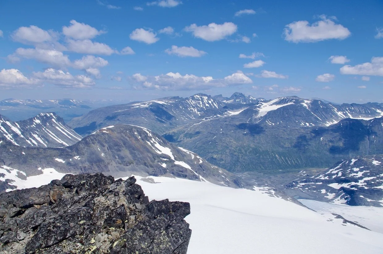 Nydelig utsikt fra ca 2000 moh. på vei til Store Smørstabbtinden, over Storbrean til Storbreahøe, med Skardstinden og Galdhøpiggen i midten bak