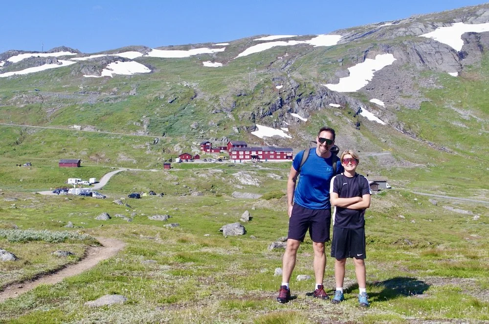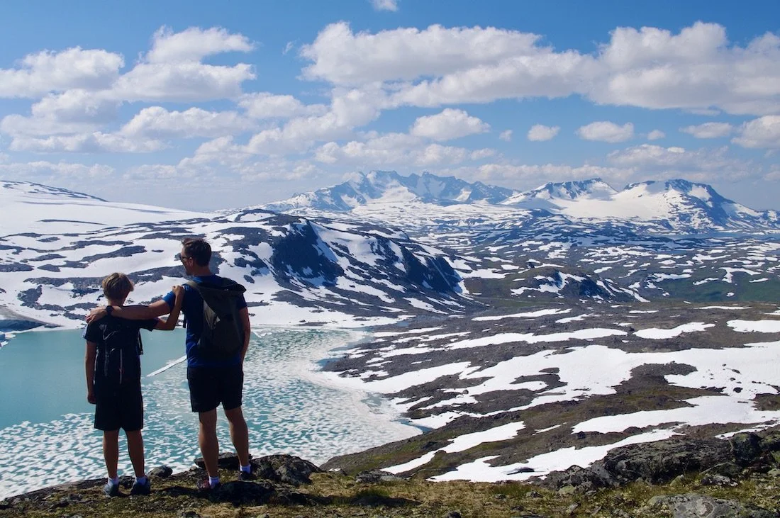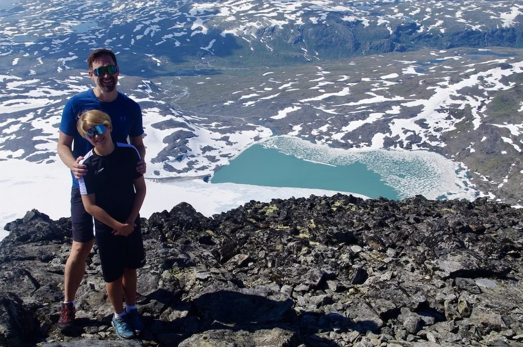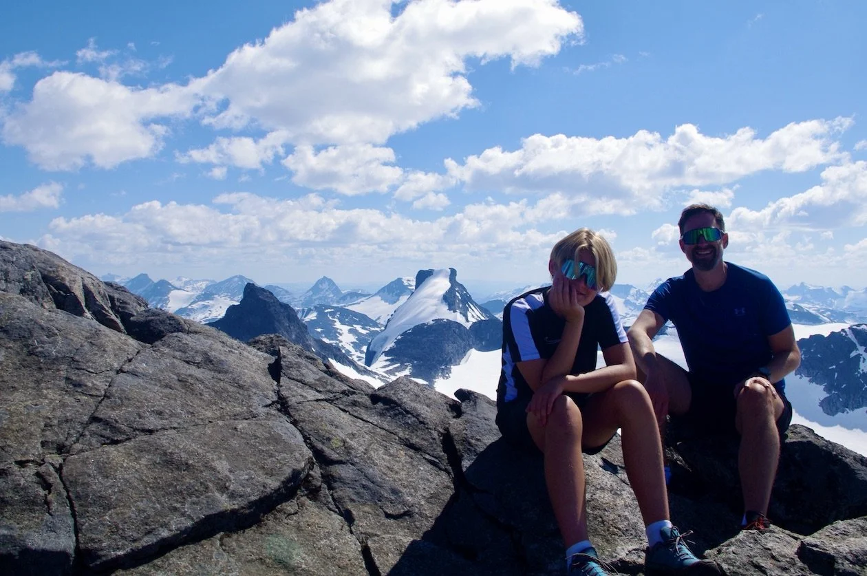 Far og sønn beundrer utsikten på vei mot Store Smørstabbtinden