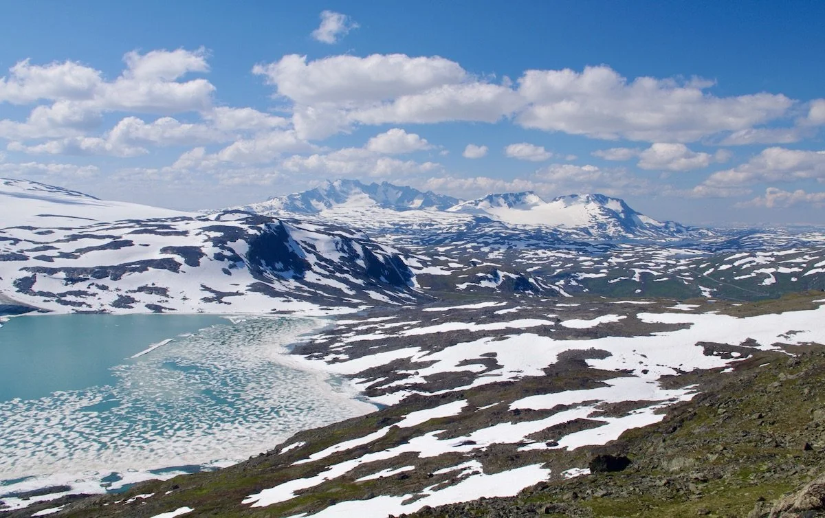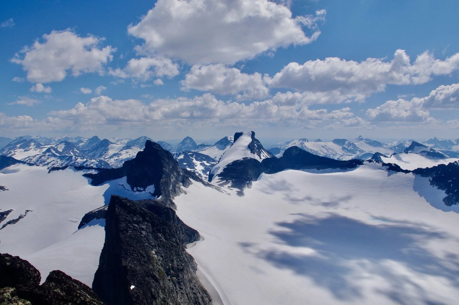 Panoramautsikt fra Store Smørstabbtinden over Leirbrean og Bøverbrean til Sognefjellet