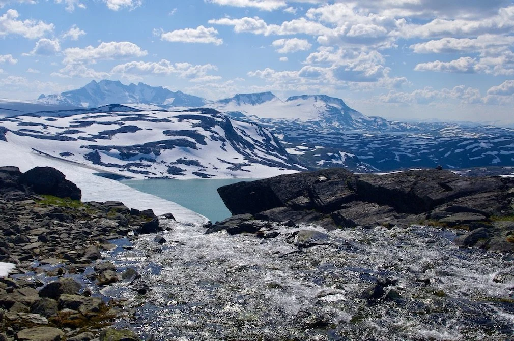 Nydelig utsikt fra stien mot Store Smørstabbtinden til brevannet under Leirbrean, Hurrungane, Fanaråken og Steindalsnosi