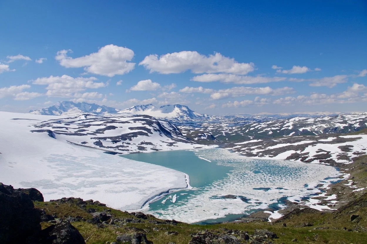 Fantastisk vakker utsikt fra stien opp til Store Smørstabbtinden mot Leirbrean og brevannet