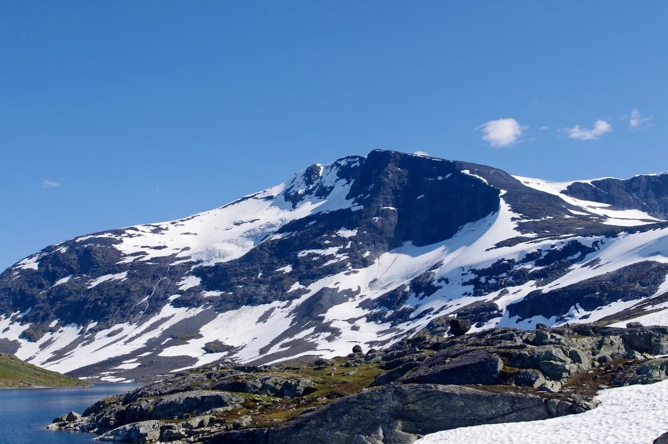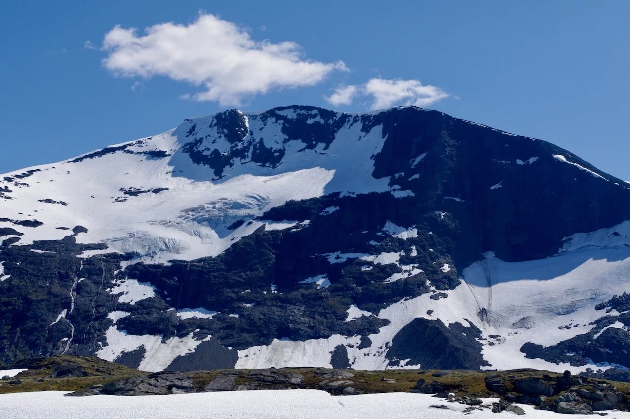 Utsikt fra Hervadammen opp til Store Steindalsnosi, et kjent landemerke ved Sognefjellsvegen