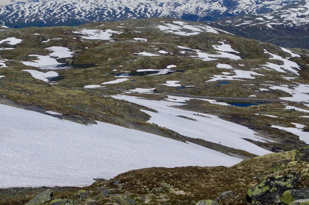 Utsikt fra Galgeberg 1503 moh. ned mot Sognefjellsvegen og turstart