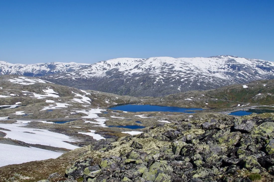Utsikt fra steinuren på vei opp til Steindalsnosi, til Øvre Hervavatnet, Prestesteinsvatnet og Store Smørstabbtinden