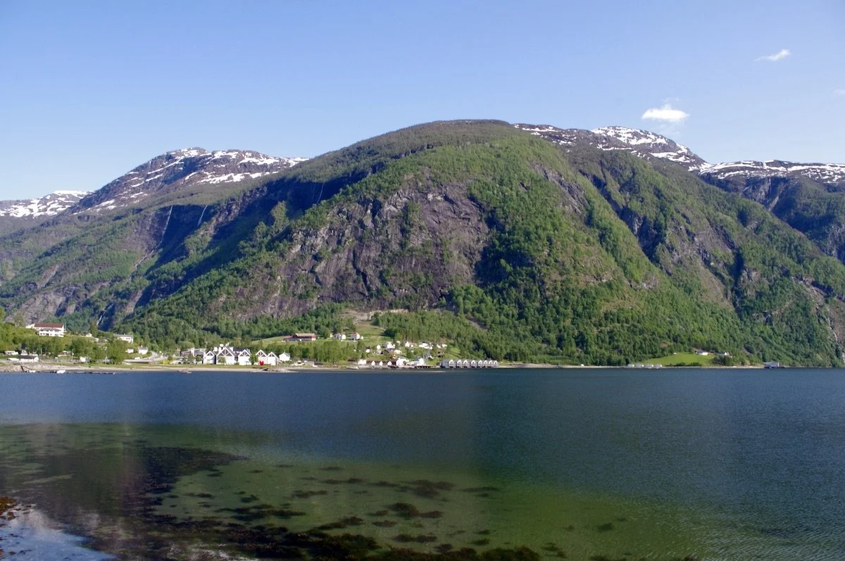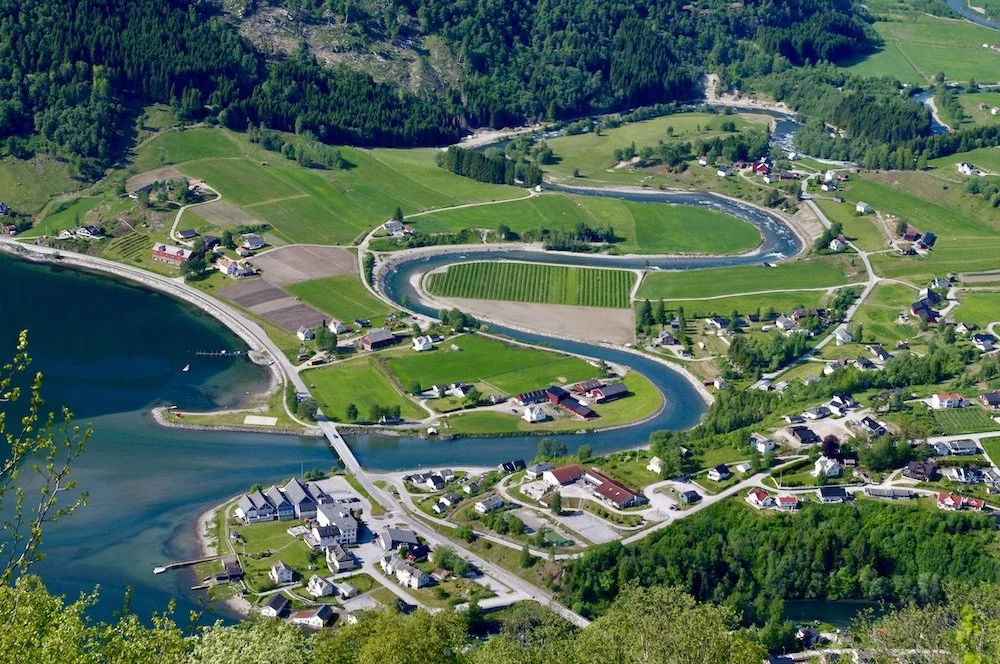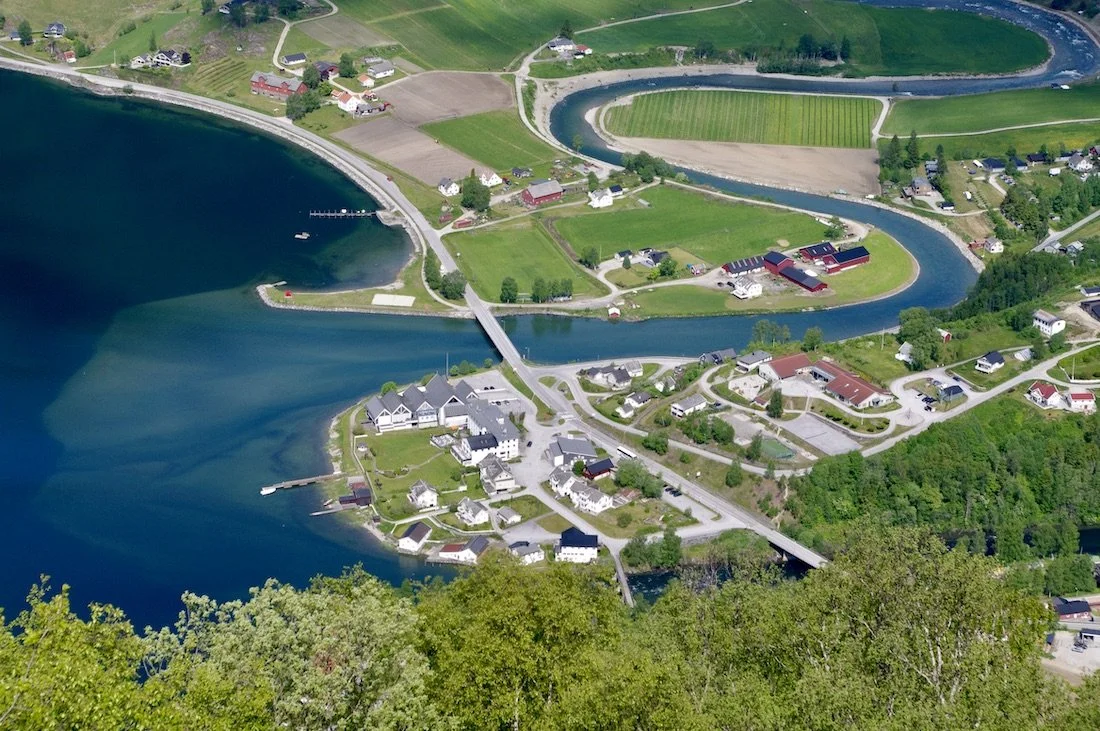 Idyllisk og spektakulær utsikt til Skjolden Brygge og Skjolden sentrum ved Lustrafjorden, med elvemunningene til Mørkridselvi og Eidselvi