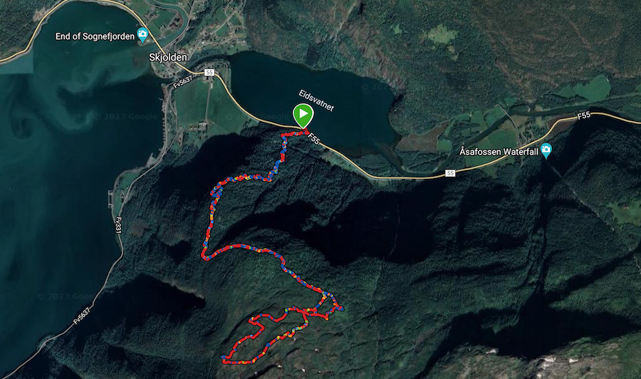 Turstart, stopp og parkering: Galdaneset ved Eidsvatnet i Skjolden 7 moh., parkerte på Lustravegens veiskulder