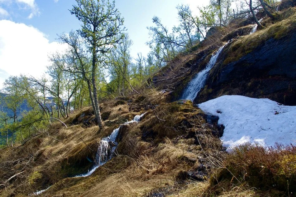 Stien mot fjellstølen Lingane krysser snøelven under fossen og fjellvenner får en forfriskende dusj