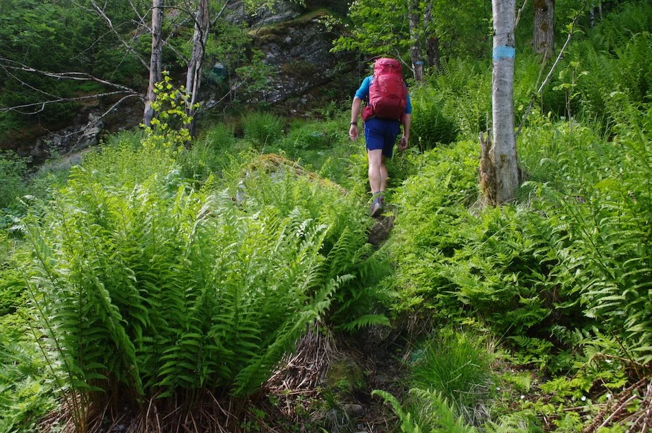 God og bratt sti gjennom frodig vegetasjon, med tydelig lyseblå merking fra start ved Galdaneset og opp til Vetahovden 530 moh.