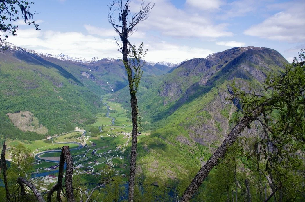 Spektakulær utsikt til Skjolden sentrum fra den bratte stien opp mot Vetahovden og Eidshovden