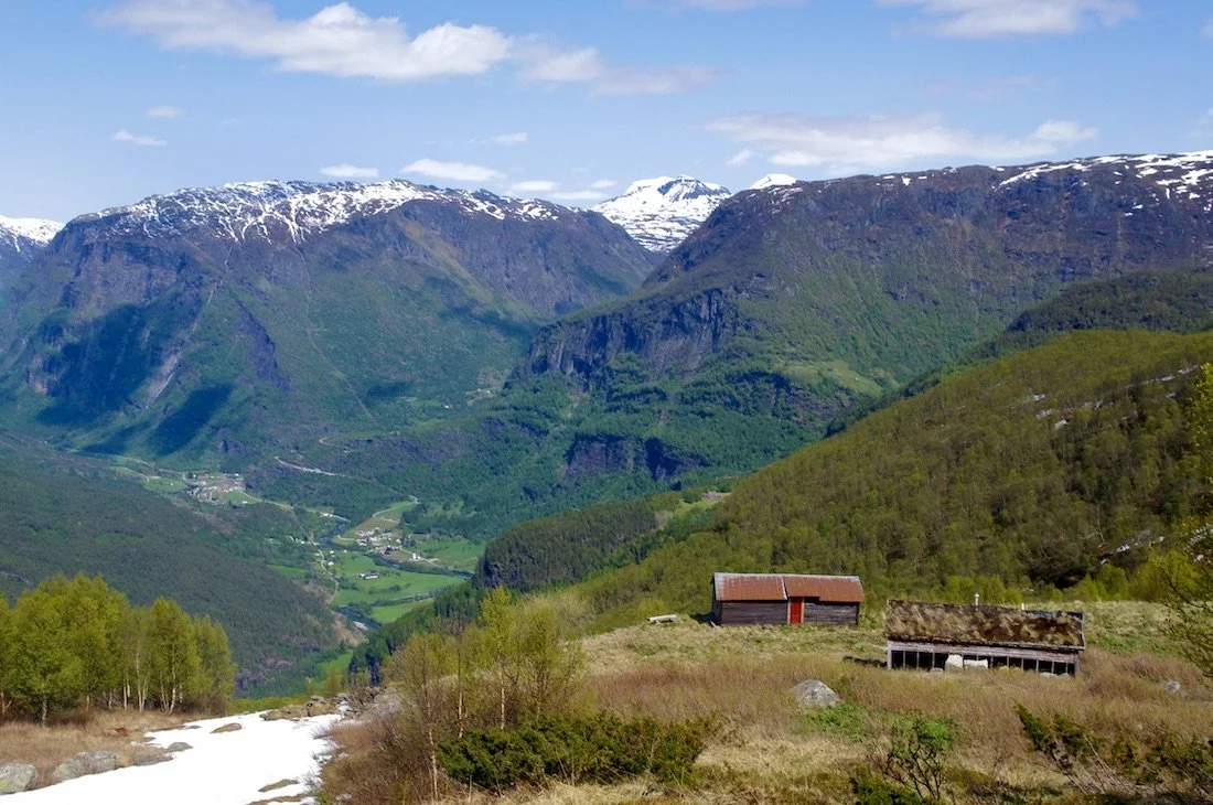 Utsikt fra fjellstølen Lingane mot Fortun - Fjellgårdene Furåsen og Fuglesteg skimtes midt imot