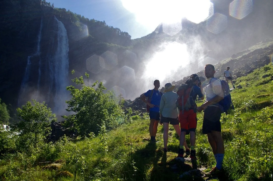 Etter rasten ved broen går vi en ekstra sløyfe, noen hundre meter, oppover langs elven mot Hanafossen. Deretter følger vi den gode og tydelige stien nedover dalen, forbi Bergheimsstølen til Bergheim og videre på traktorvei ned til Sørsidevegen, og tilbake til Feigum. På Feigesagi nyter vi nystekte vafler og gode leskende forfriskninger i den nydelige sommerdagen. Returen til Høyheimsvik avsluttes med en flott og spennende rundtur på Lustrafjorden, i regi av Øystein Magnus på Luster Fjordhytter.