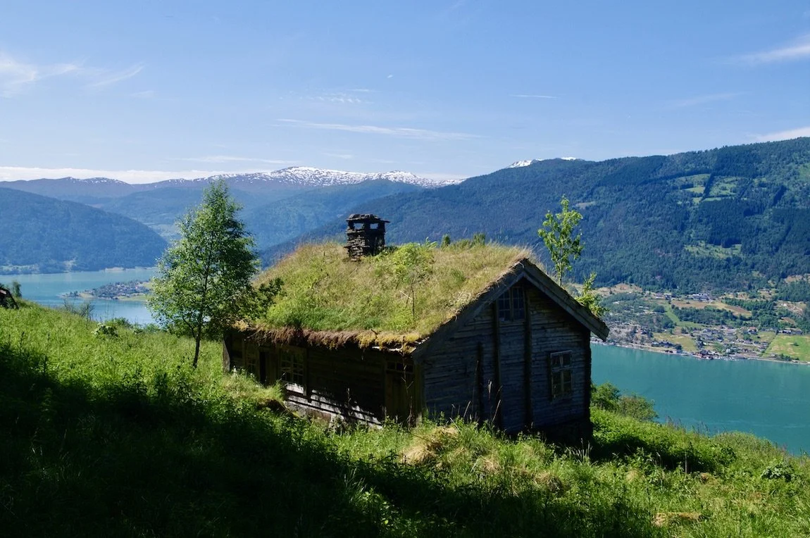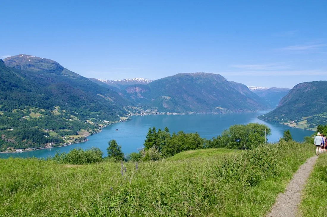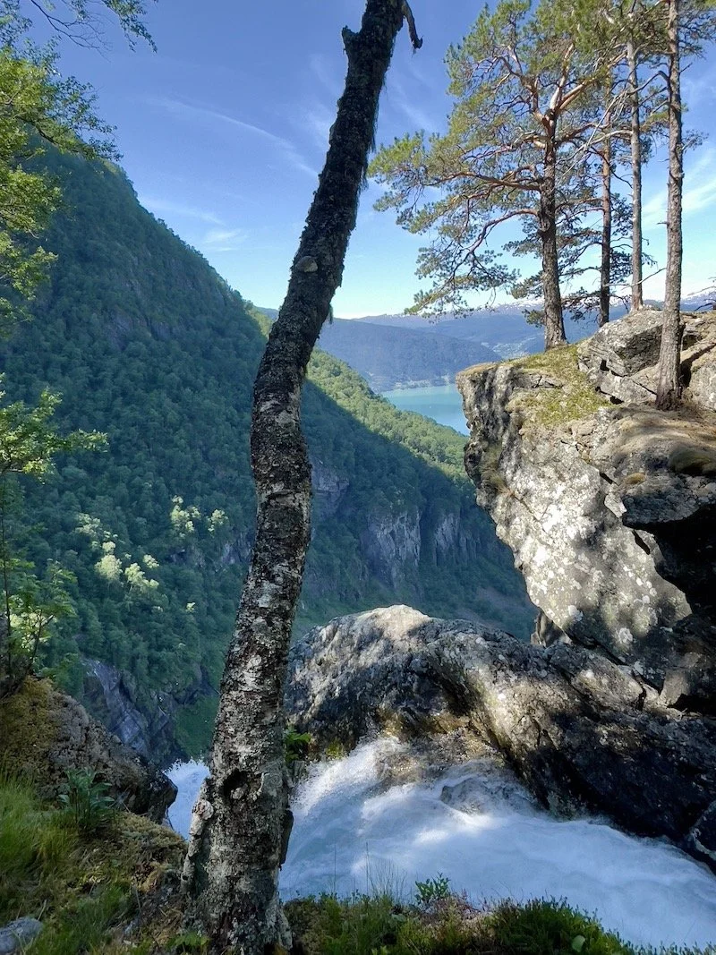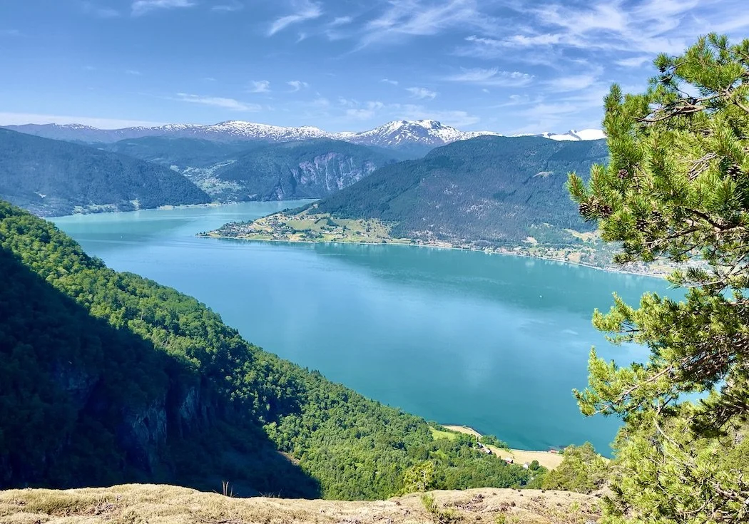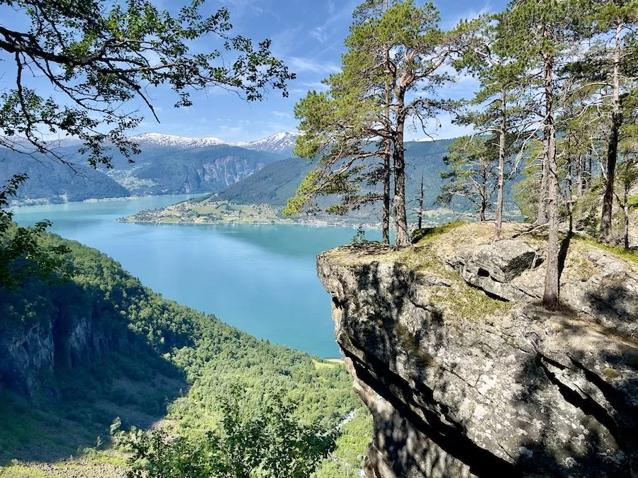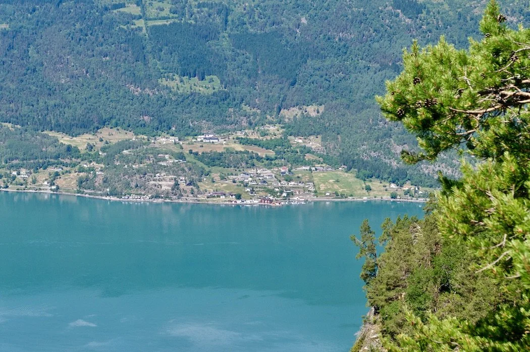 Utsikt fra toppen av Feigefossen mot Lustrafjorden og Nes