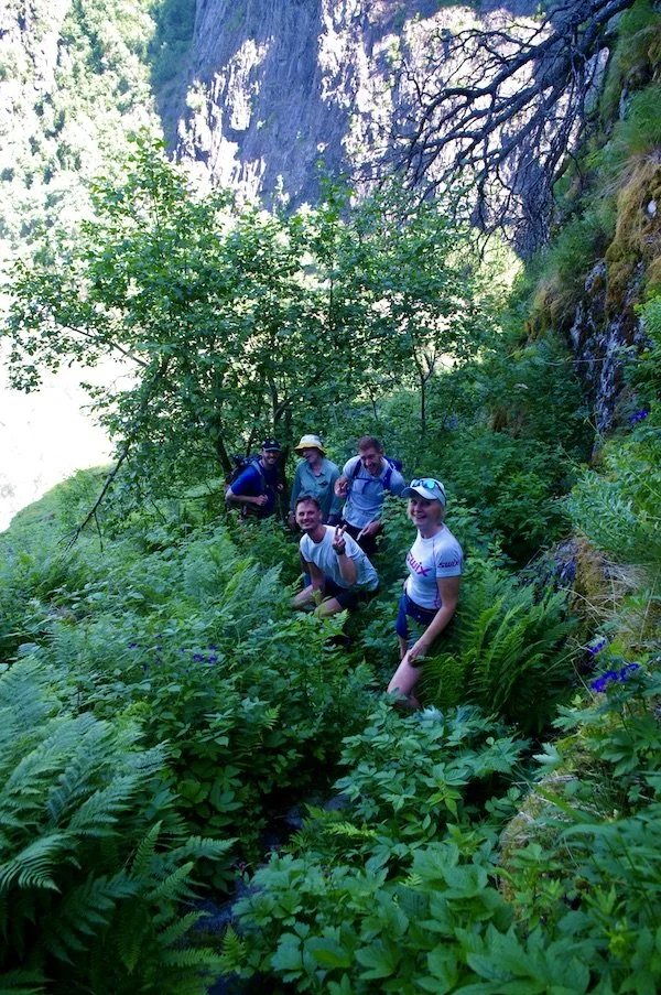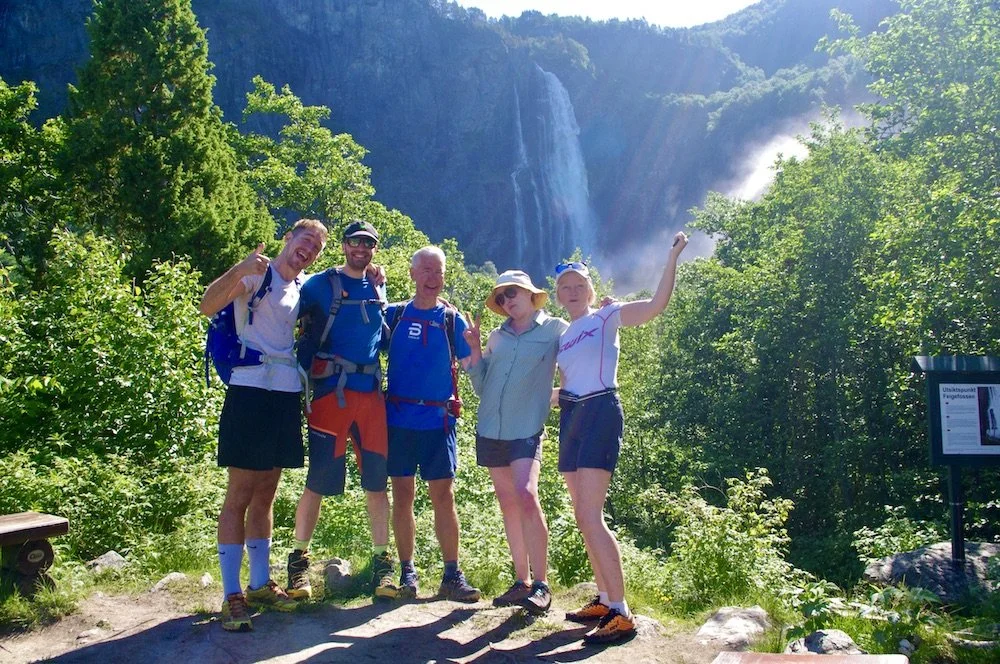 Glade fjellvenner på Lustrafjorden, med Feigum, Feigesagi og Feigefossen som bakgrunn