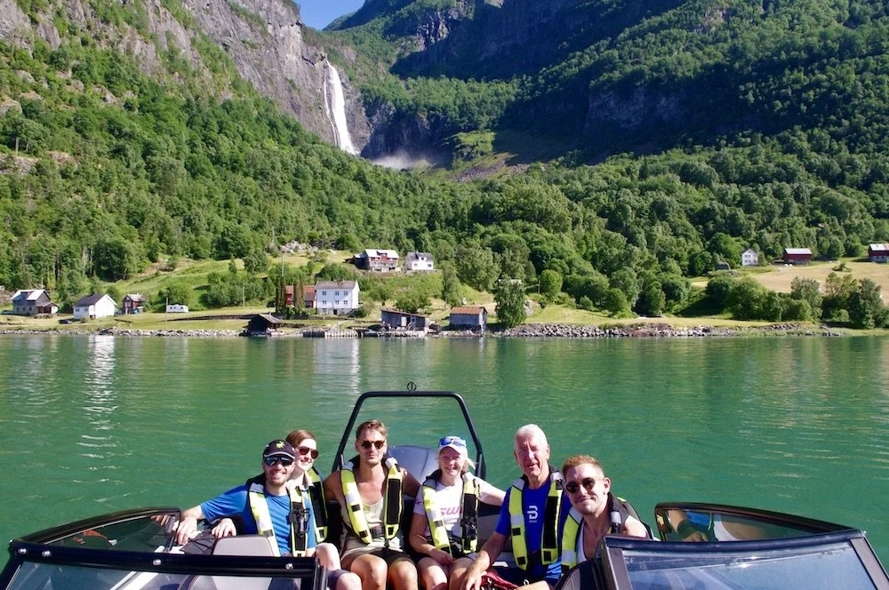 Glade fjellvenner på Lustrafjorden med Feigum, Feigesagi og Feigefossen som bakgrunn