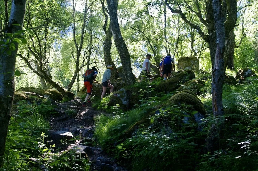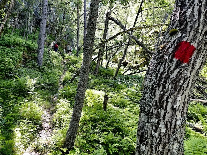 Stien svinger seg opp fra fossejuvet til skogsområdet på juvkanten