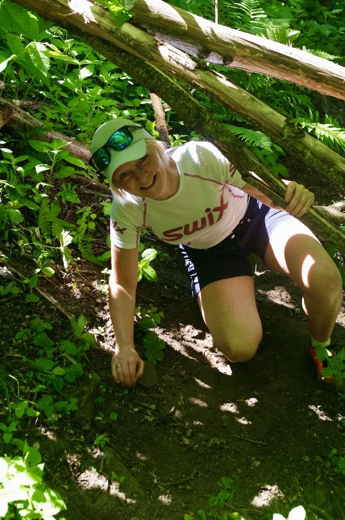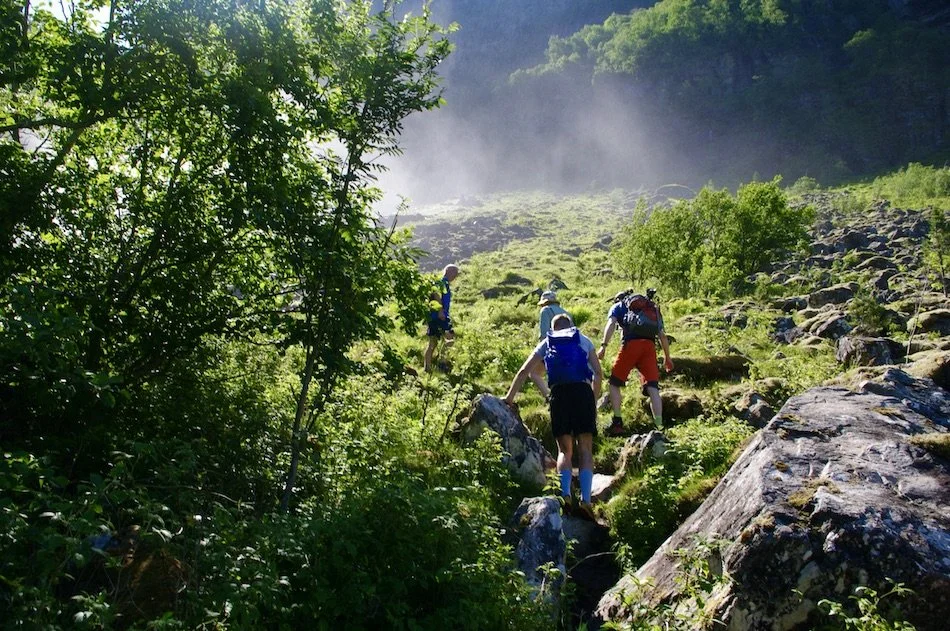 Like ved Utsiktspunkt Feigefossen tar vi oppover på den rødmerkede stien, først i østlig retning og deretter bratt oppover i sørlig retning, og góvet fra fossen gir oss en avkjølende dusj.