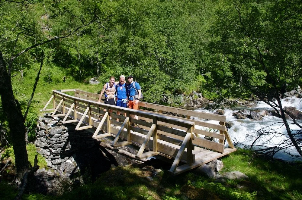 Glade fjellvenner på den nye flotte broen over Feigeelvi