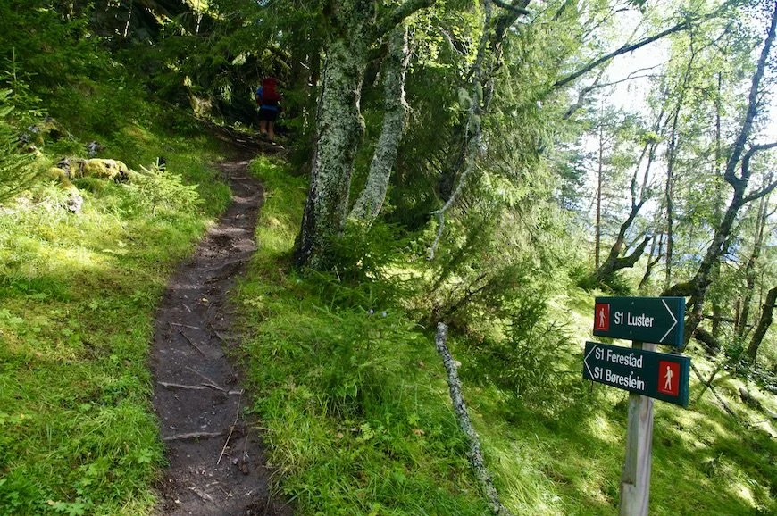Fra Ferestad fortsetter vi oppover på stien i fin blandingsskog, og snart krysser vi en fin liten bekk i Langeskår før vi går bratt oppover i lien under Børesteinen. De siste kneikene opp til den storflotte utsiktsplassen på Børesteinen, blir det ekstra bratt og litt spennende klyving må til.