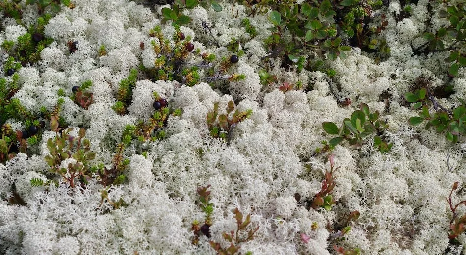 Mye mykt og fint reinlav i det nydelige terrenget mot Fjøsnanosi