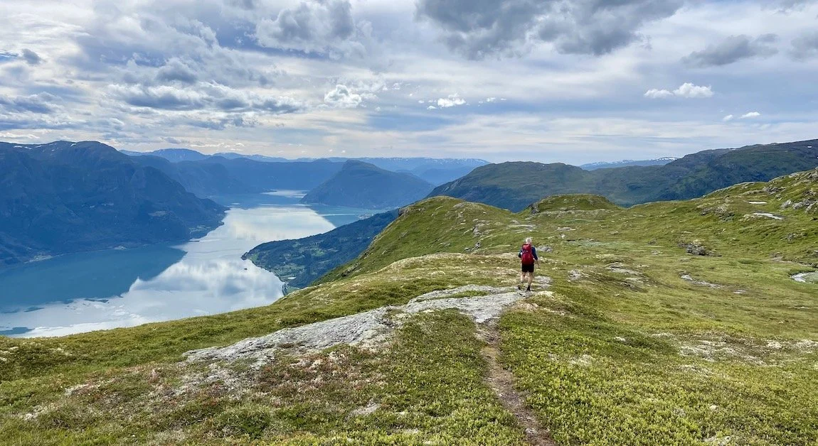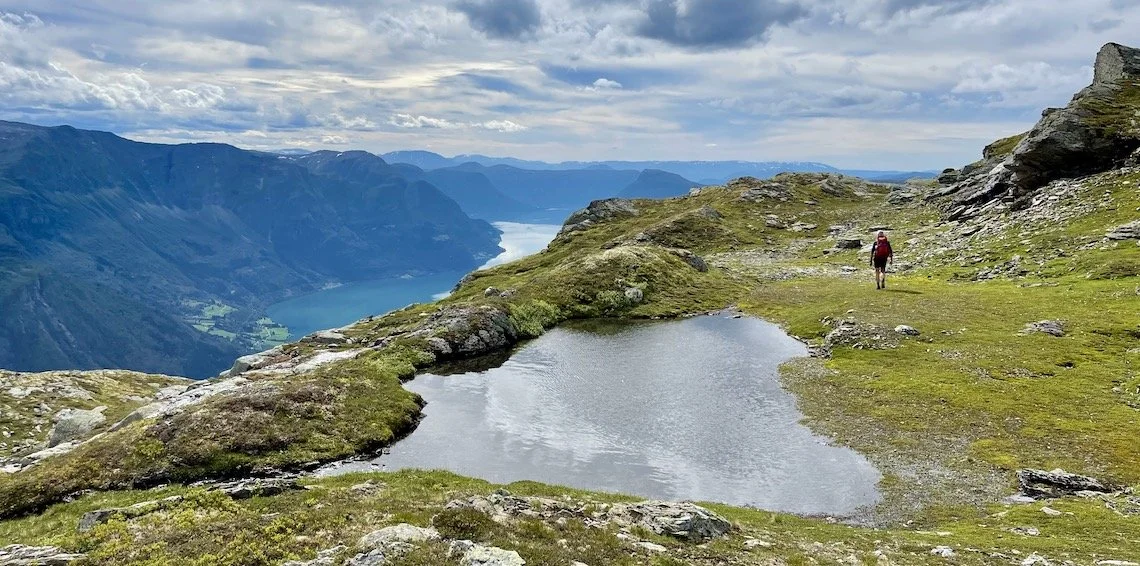 Spektakulært og storflott fra Fjøsnanosi utover Lustrafjorden fra Bakken ved Mordalselvi til Solvorn