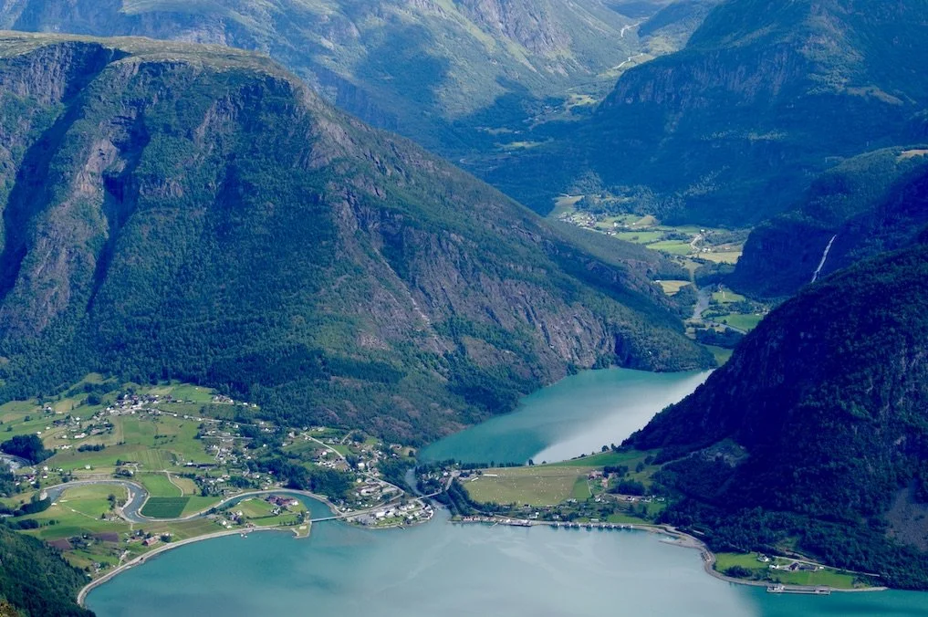 Spektakulær utsikt fra Fjøsnanosi 1306 meter over Lustrafjorden, mot vakre Skjolden og Fortun med Mørkridselvi t.v., Eidsvatnet og Fortunselvi t.h.