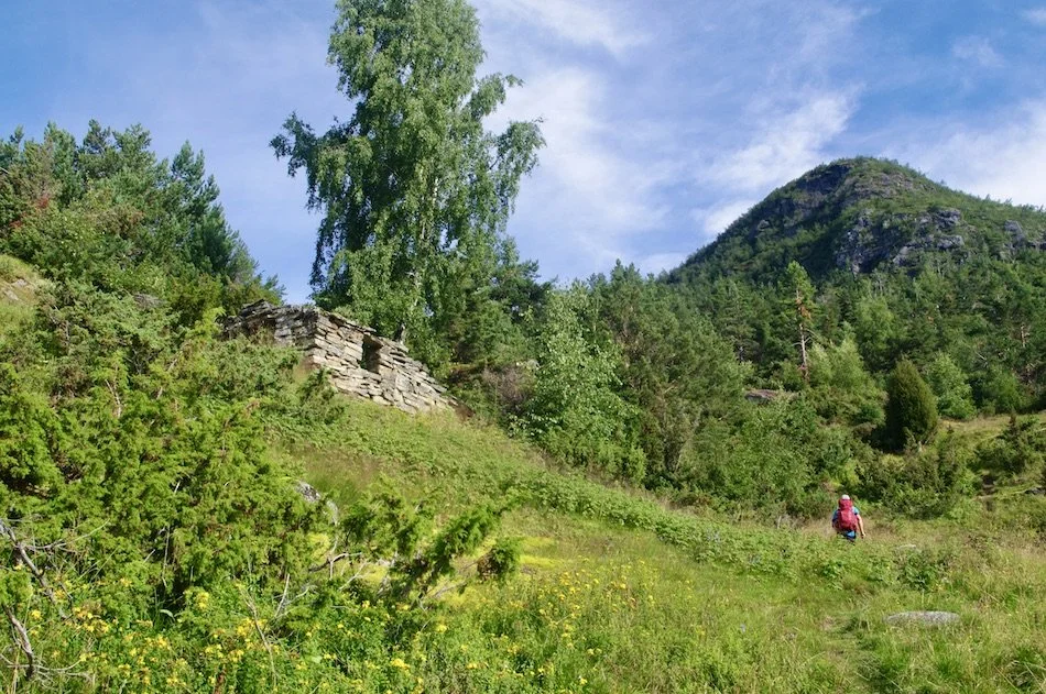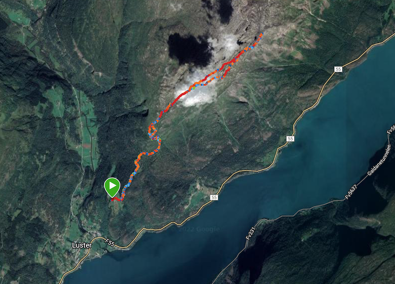 Det er en fin sensommerdag i Sogn, og vi kjører Lustravegen til Luster og tar der av til Dalsdalen, og etter et par hundre meter tar vi inn på Bergsvegen oppover til Berge. En hyggelig bonde har tilrettelagt en liten turparkeringsplass på gården her oppe, og vi parkerer der. Dagens turmål er å gå til Fjøsnanosi 1306 moh., via Børesteinen.