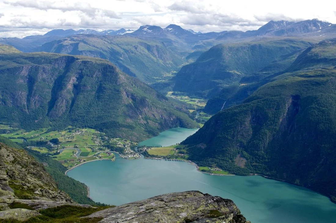 Spektakulær utsikt fra Fjøsnanosi over Lustrafjorden mot vakre Skjolden og Mørkridselvi t.v., og Eidsvatnet, Fortunselvi og Fortun t.h.