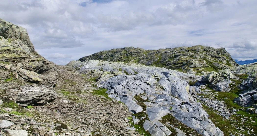 Spennende “månelandskap” av blågrå stein og en bred naturlig tilrettelagt “gate” like ved toppen av Fjøsnanosi