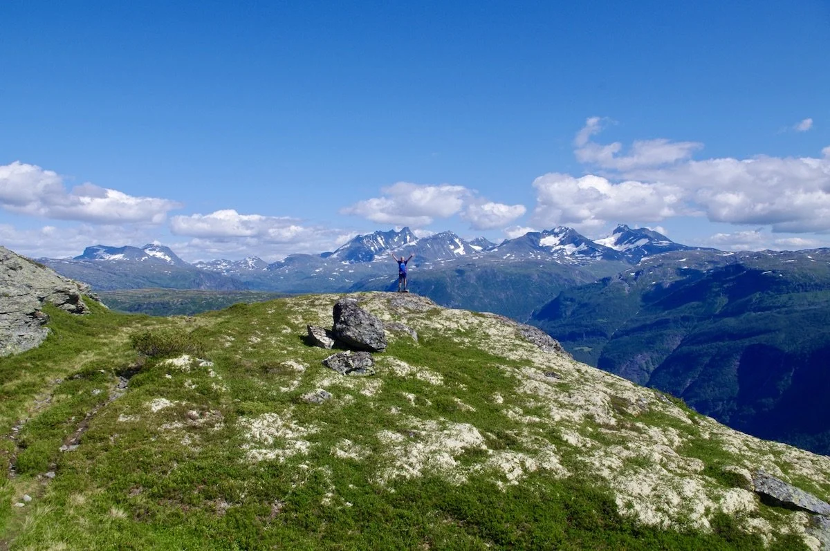 På toppen av Haugsnosi med utsikt til høyfjellene på sørsiden av Lustrafjorden