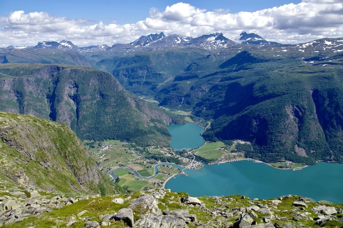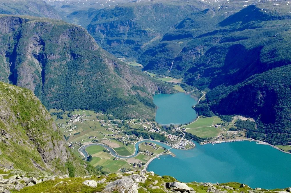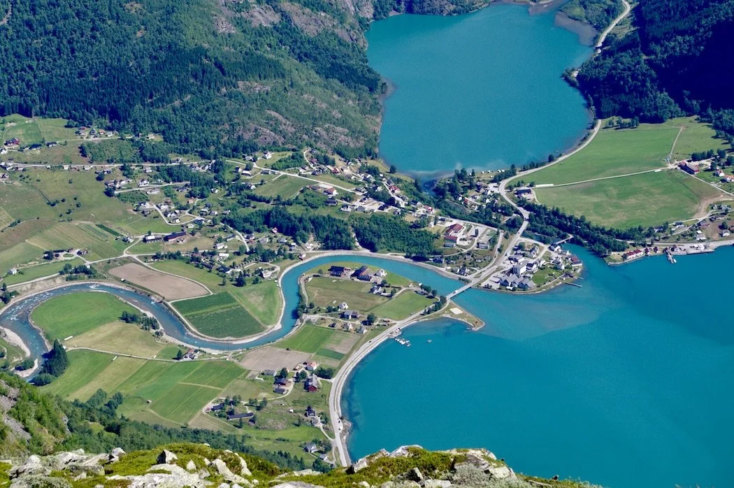 Magesug-utsikt fra Haugsnosi til vakre Skjolden, Mørkridselvi, Eidsvatnet og Lustrafjorden