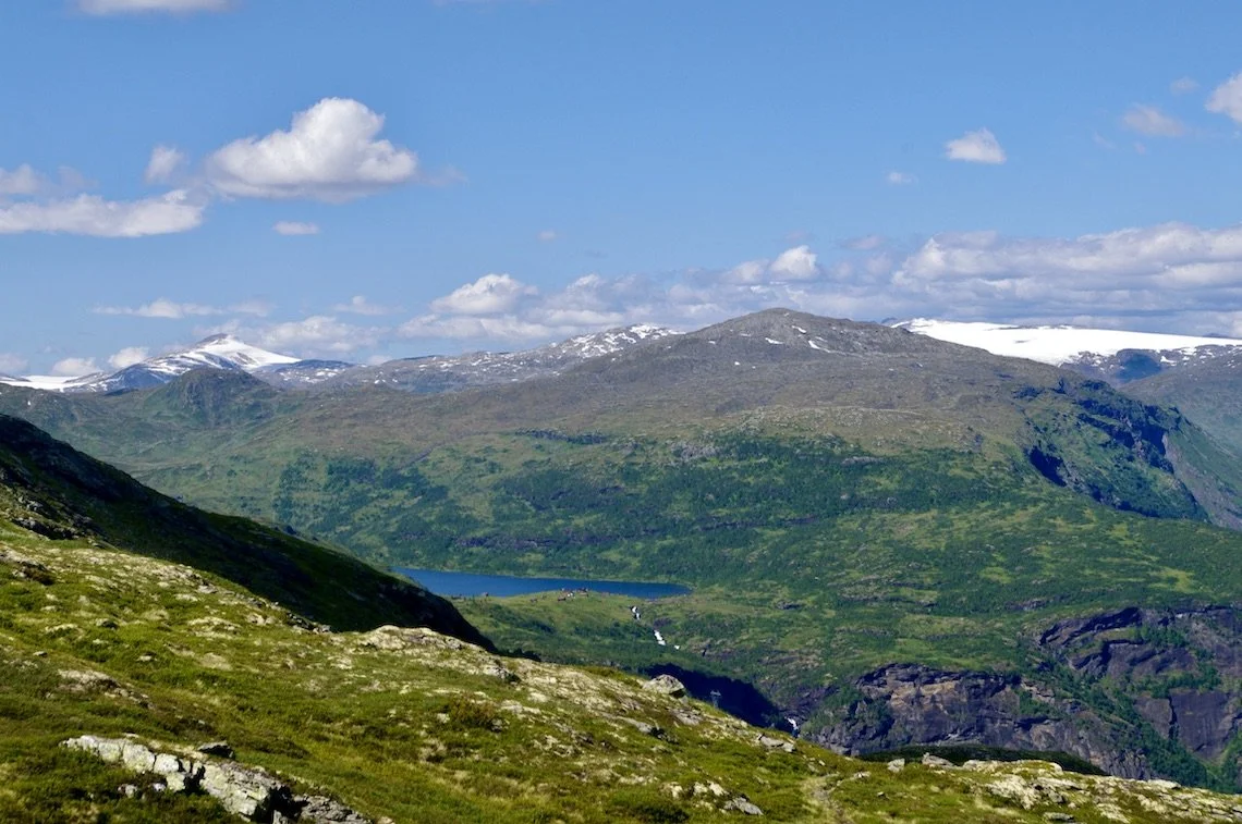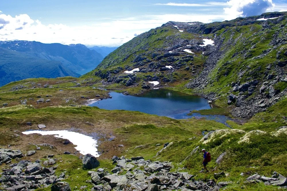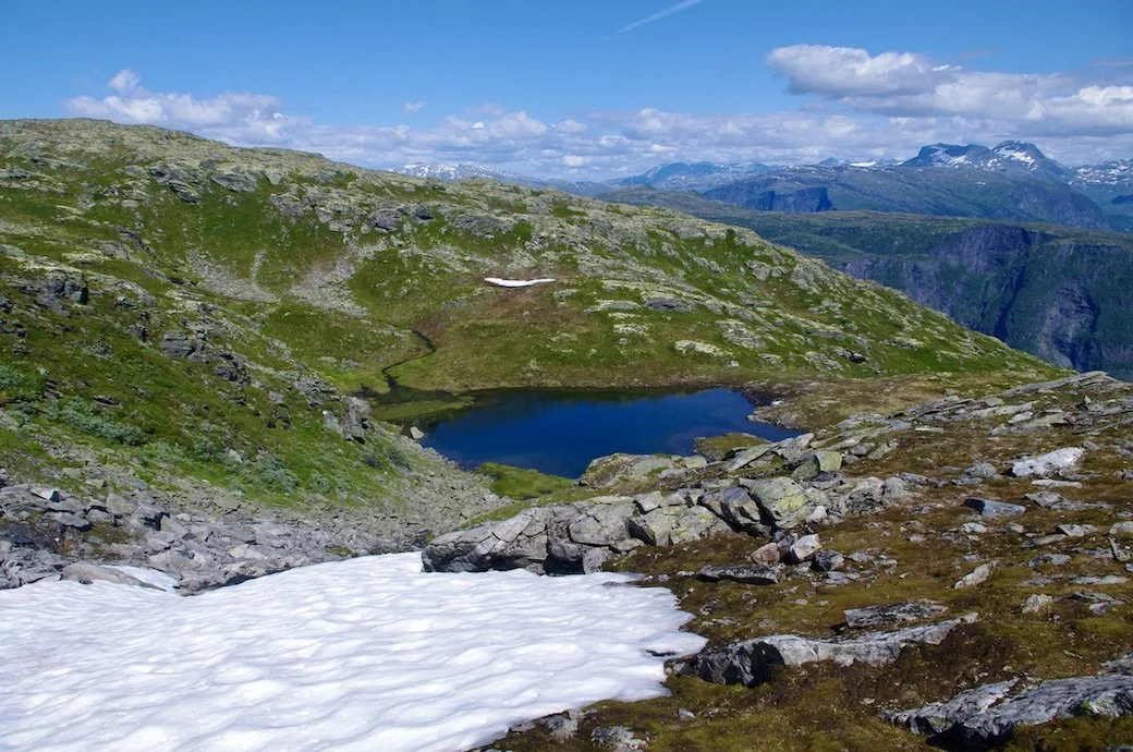 Nydelig terreng og fjellvann på østsiden av Haugsnosi