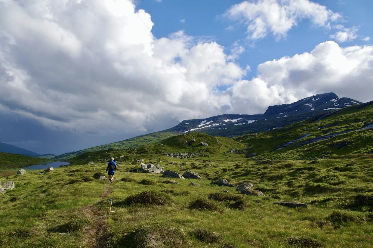 Flott og tydelig merket sti i nydelig høyfjellsterreng mot Nystølsbotn med Asbjørnnosi over t.h.