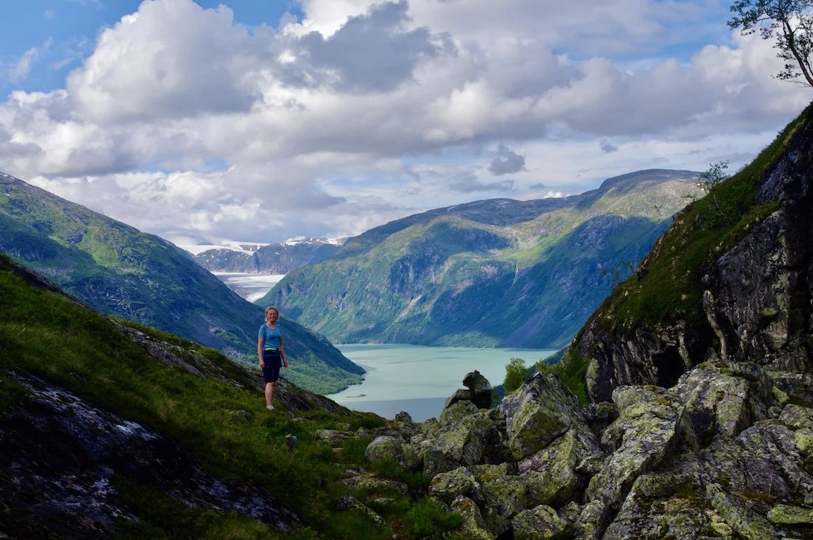 Nydelig utsikt fra Klanten i Leirdalen mot Tunsbergdalsvatnet og Tunsbergdalsbreen