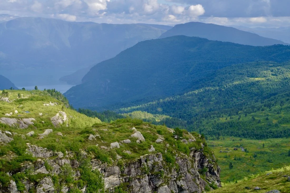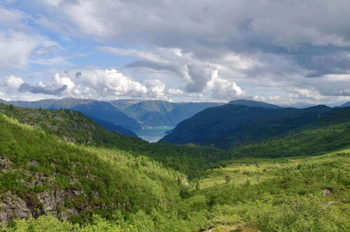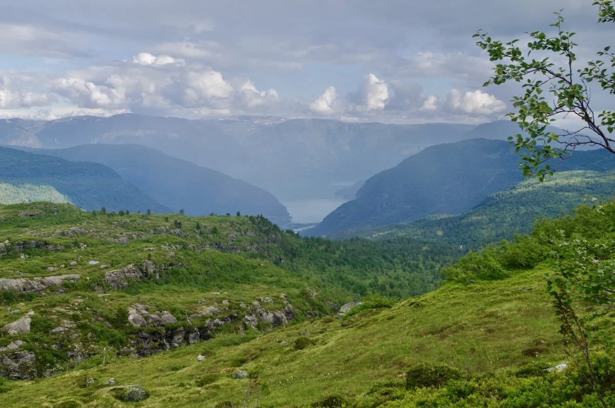Idyllisk og frodig i Nystølsskorane med utsikt til Nystølen og Lustrafjorden