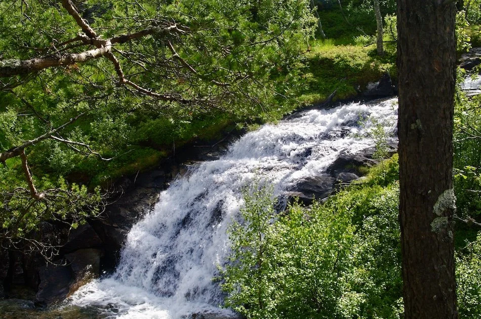 Fra turparkeringen krysser vi Nystølselvi på bro og følger skiltet, merket og tydelig sti slakt oppover i et nydelig og mykt terreng gjennom flott blandingsskog med furu og bjørk. Stien er flott tilrettelagt med klopper og småbroer, og det er tett med blåbærlyng og modne nydelige blåbær langs den ca 2 km lange stien opp til Nystølen 640 moh.