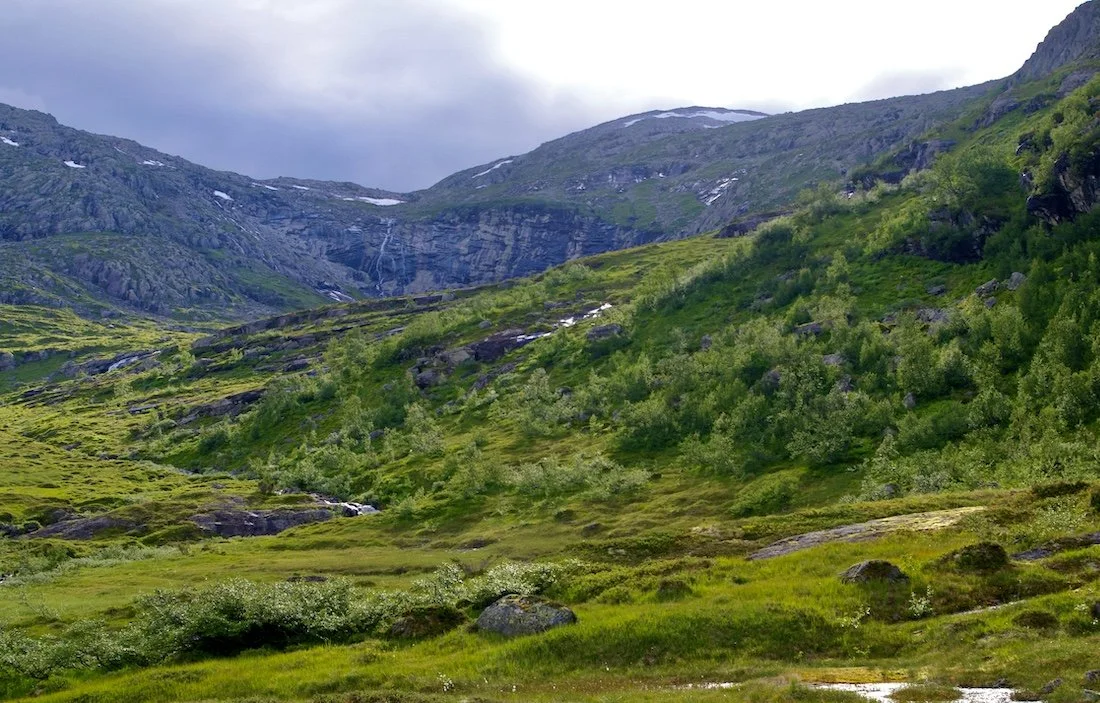 Utsikt fra frodige Nystølsbotn mot Grøndalseggi 1421 moh.