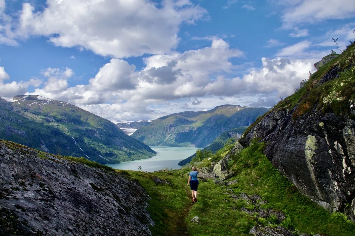 Storslott utsikt fra toppen av Nystølsskorane mot Tunsbergdalsvatnet og Tunsbergdalsbreen