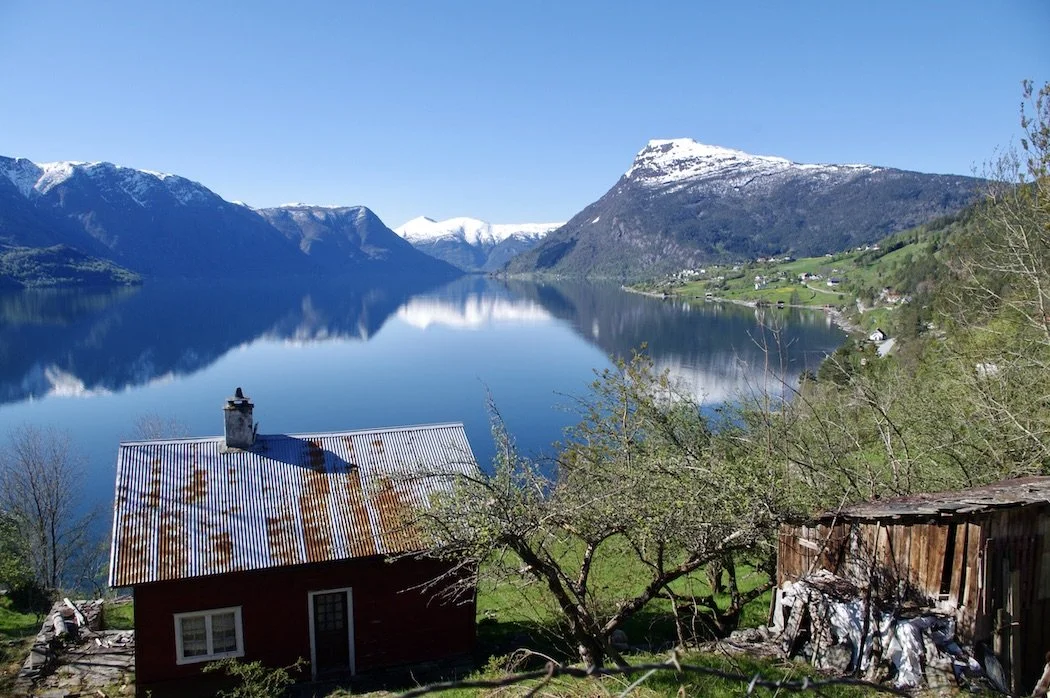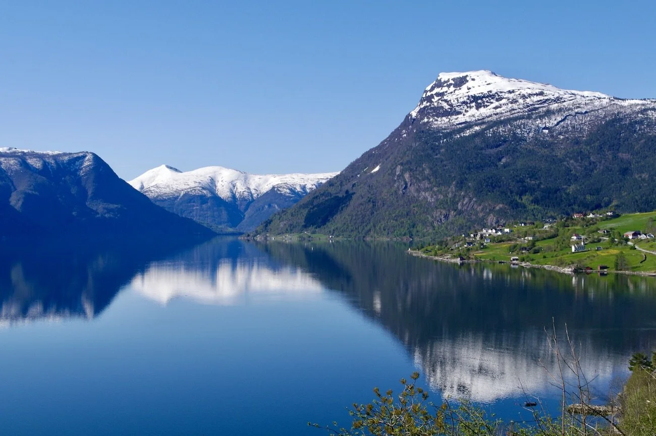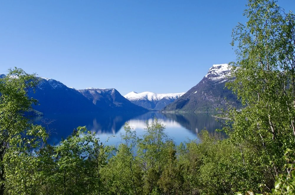 Blikkstille og silkemyk luft over Lustrafjorden på Nasjonaldagen
