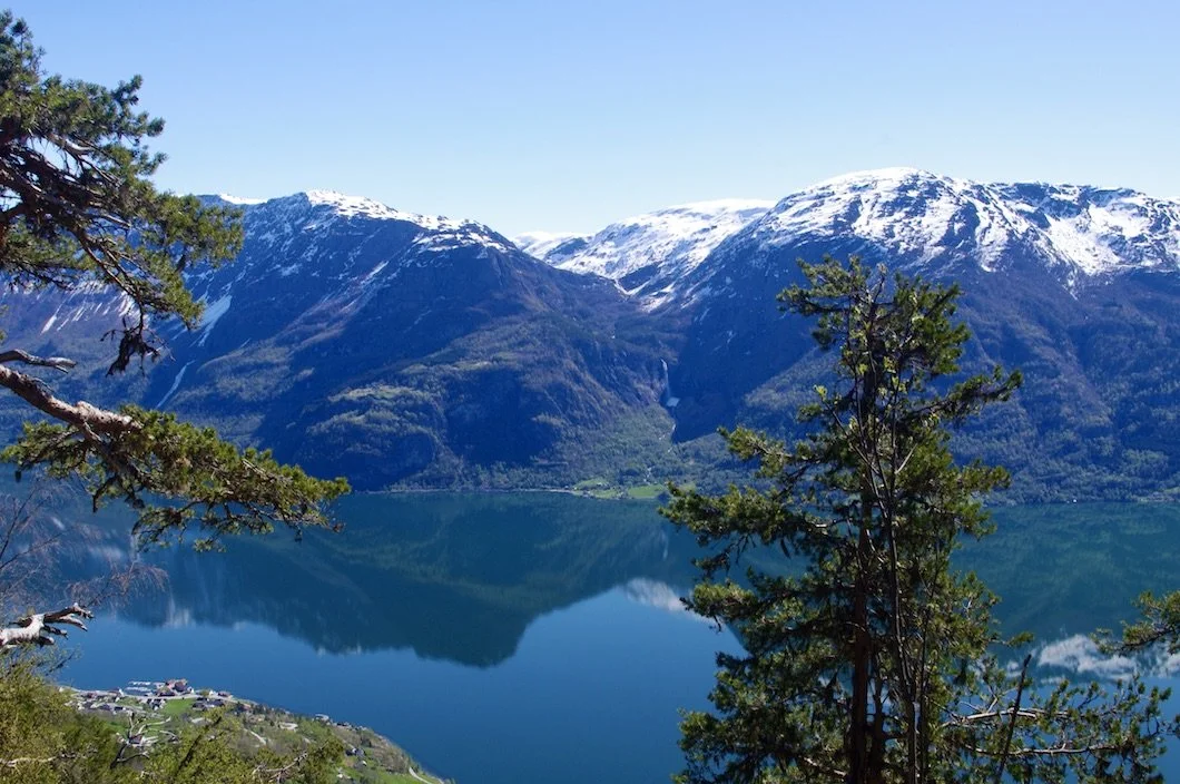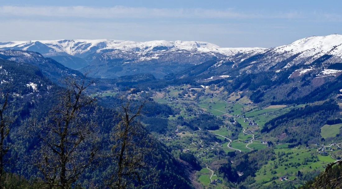 Utsikt fra Holten mot Indre Hafslo og med fjellene og breen over Fresvik lengst bak