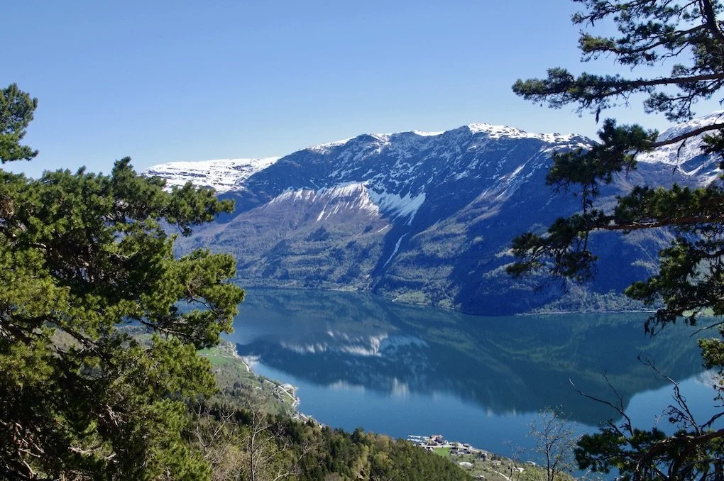 Nydelig utsikt til Høyheimsvik, Lustrafjorden og Feigedalsfjellet