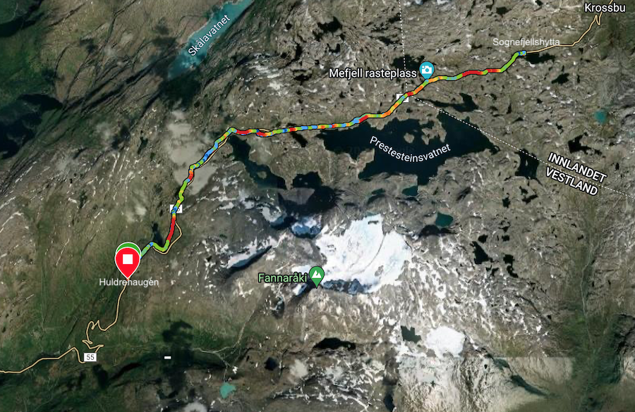 Snart passerer vi fylkes- og kommunegrensen mellom Vestland og Oppland, Luster og Lom, og Mefjell rasteplass med Fanaråkmonumentet. Herfra bruker vi kort tid de to siste kilometerne bort til til Sognefjellshytta, der vi nyter en lang lunsjpause i koselige omgivelser.