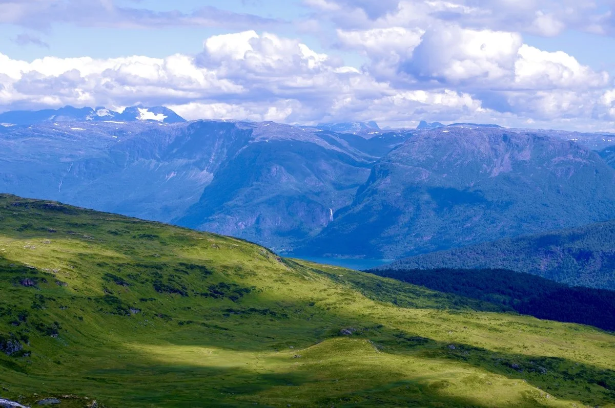 Toppvarden på Skoganipa mot fjellrekken der grensen mellom Luster og Sogndal kommune går
