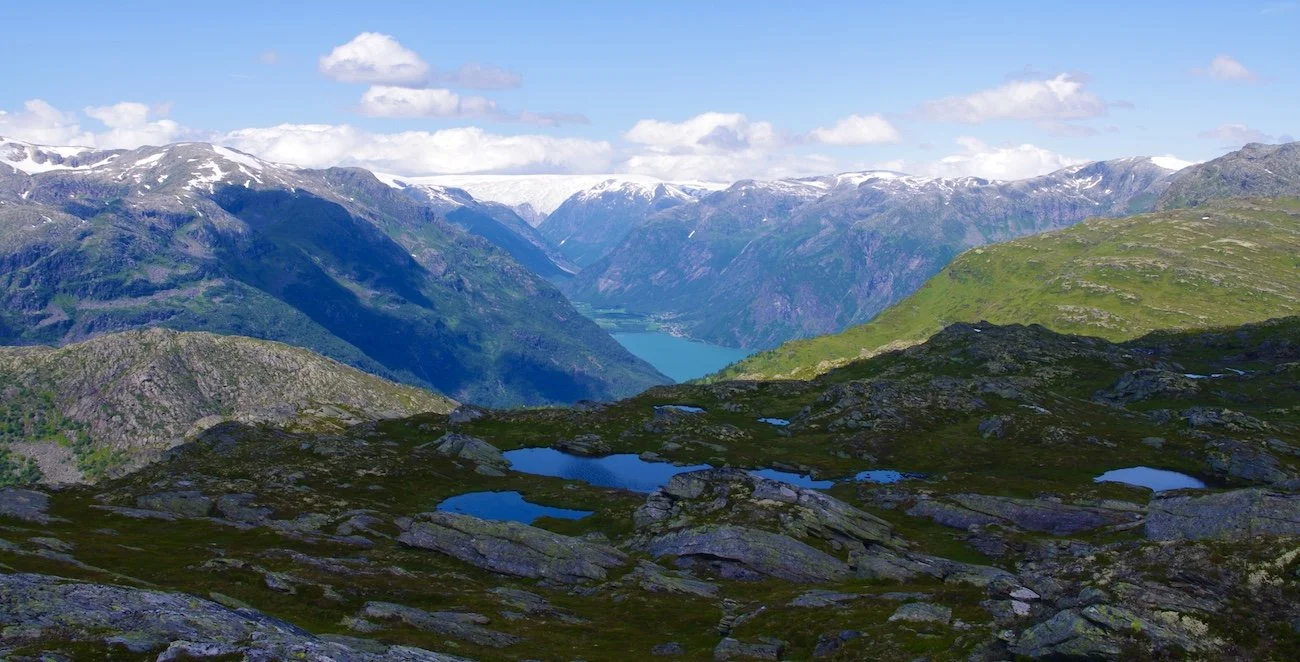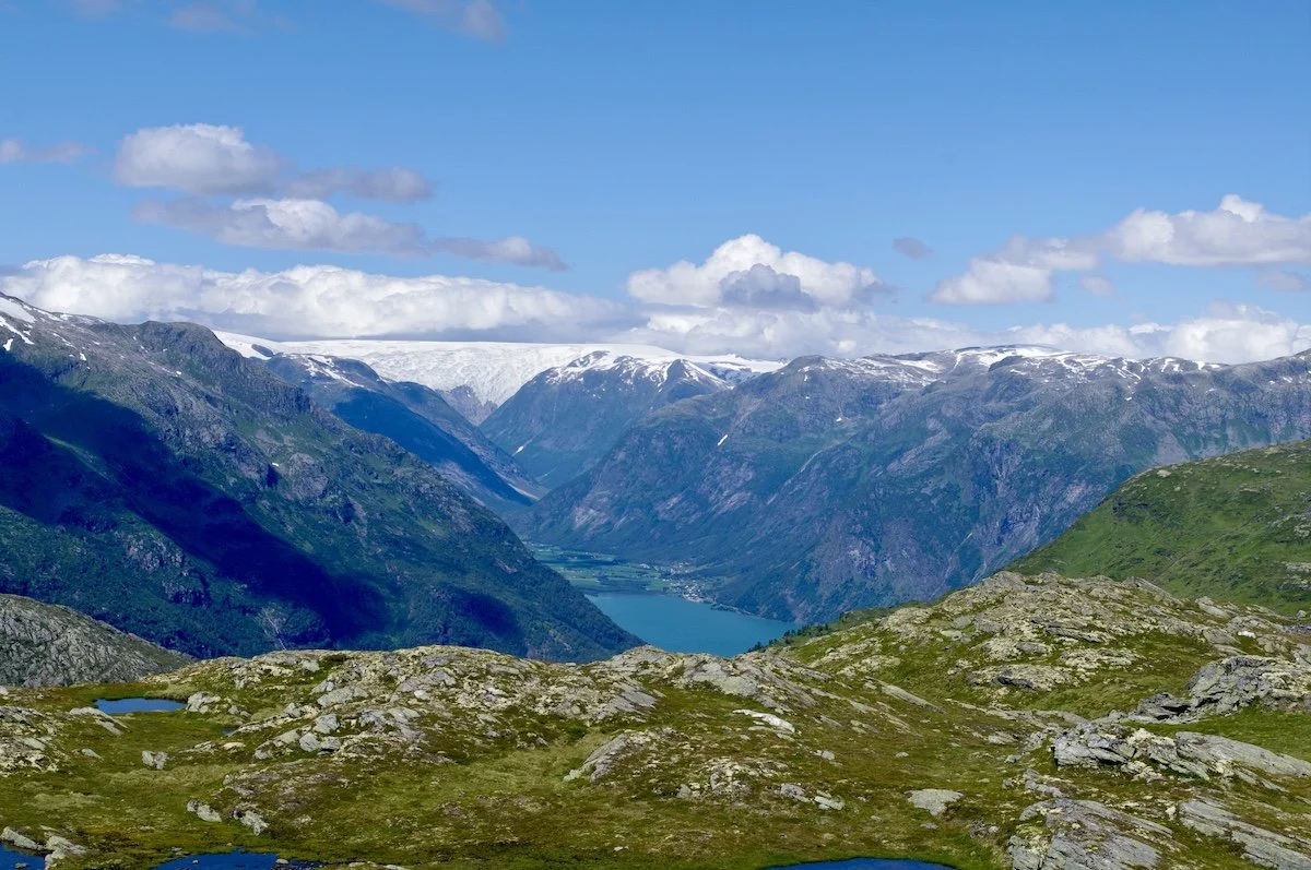 Nydelig utsikt fra Skoganipa mot Veitastrondsvatnet, Veitastrond og Langedalsbreen