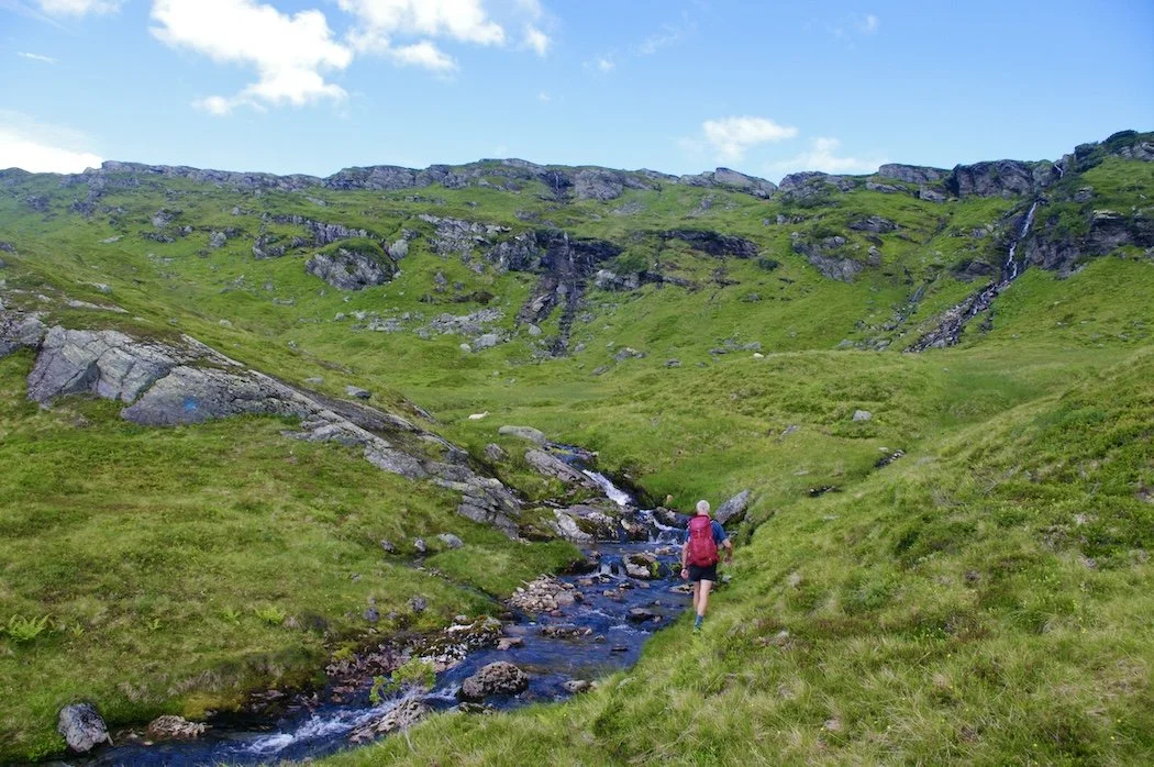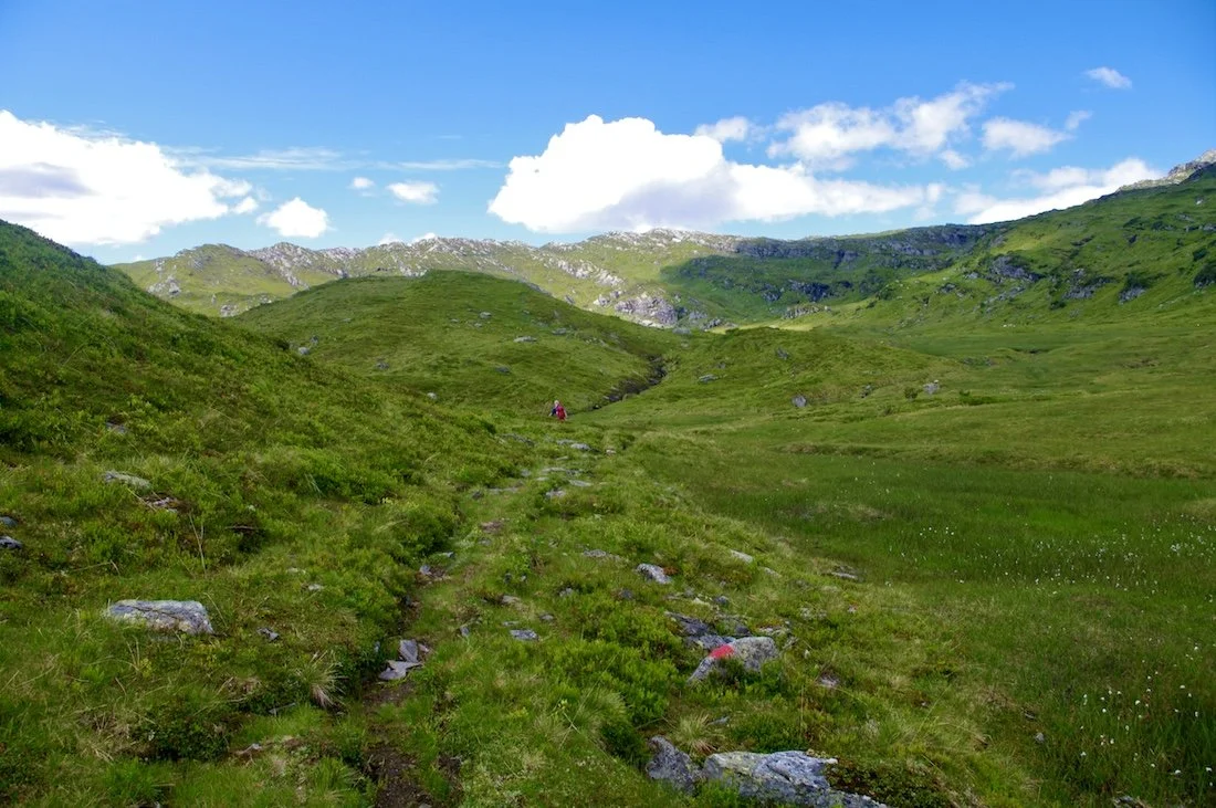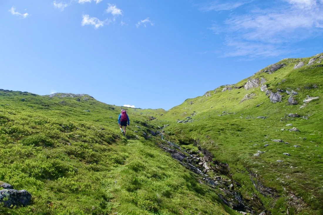 Bratt oppover i mykt og flott høyfjellsterreng mot Skoganipa