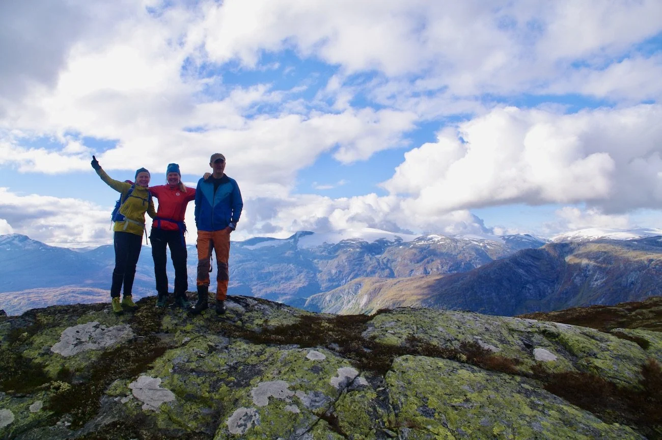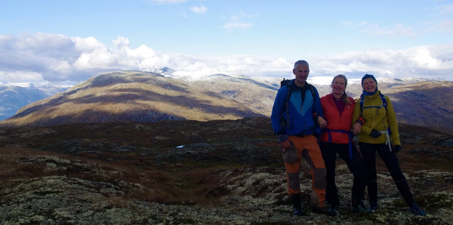 Glade fjellvenner på Kollen 1178 moh. med utsikt mot Buskrednosi og Vangsen