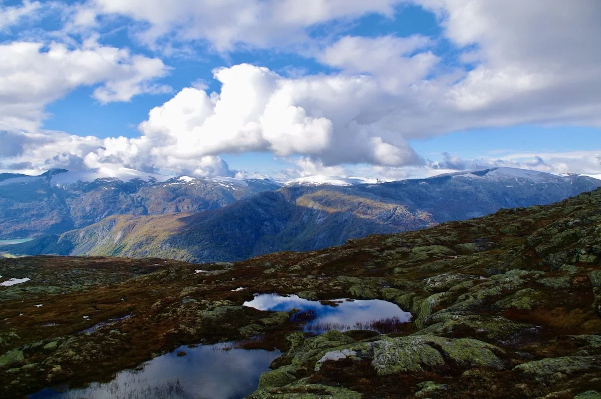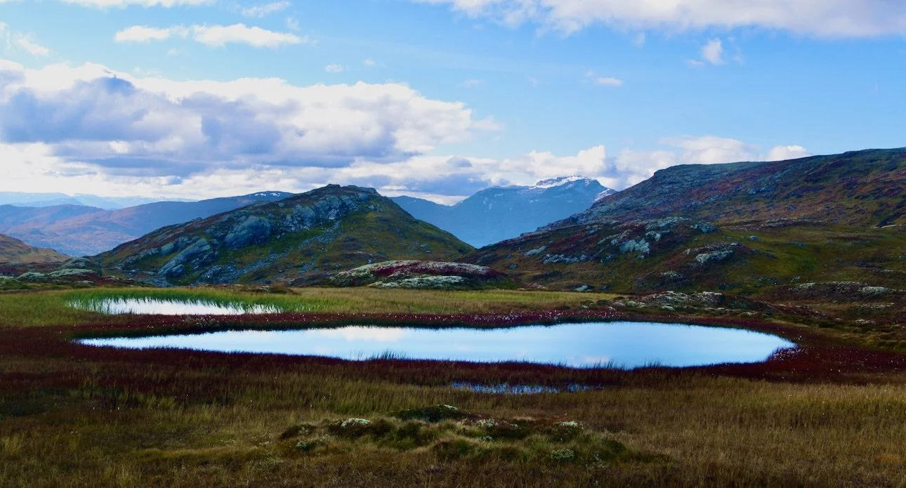 Nydelige myrer og tjern i Vågsdalen med utsikt til Asbjørnnosi mellom Grimaklanten og Vågsberget